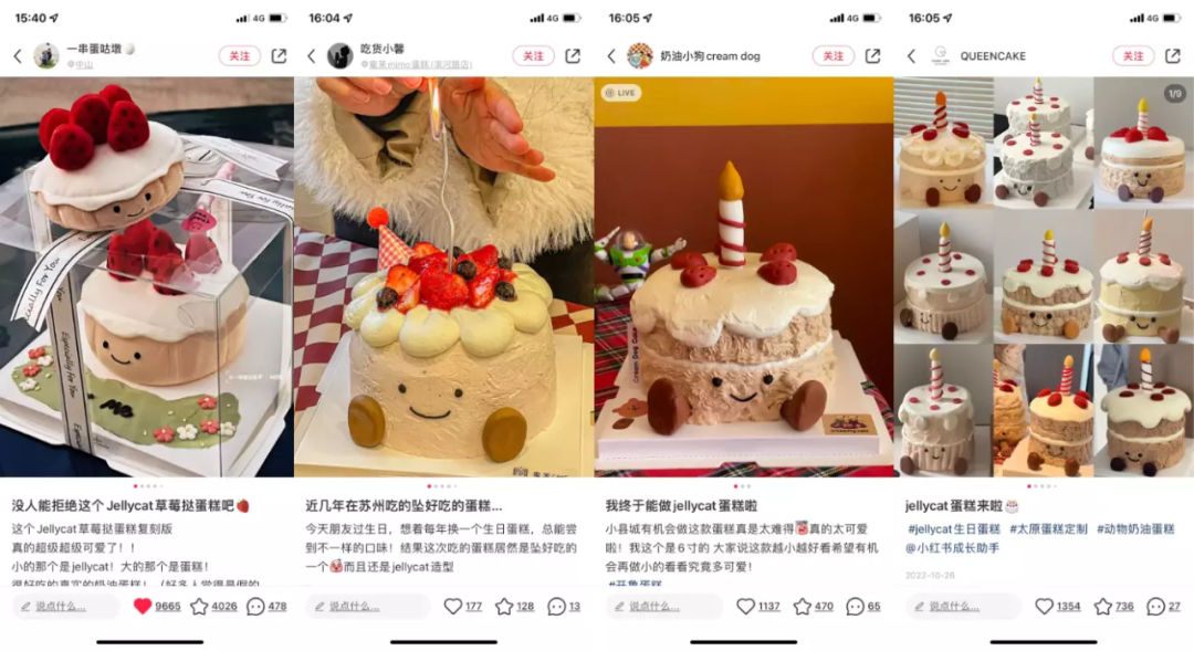 在烘焙品類中, 草莓玲瓏紅嫩的造型與糕點好吃吸睛的追求也相得益彰,“草莓蛋糕”成為山姆、盒馬、好利來、多樂之日等品牌的上新選擇。不過,消費者對于草莓蛋糕的熱愛不止如此,很多消費者甚至開始以草莓為創(chuàng)意定制蛋糕,比如在小紅書,一款仿照英國玩具品牌jellycat毛絨玩具定制的草莓撻蛋糕廣受歡迎。