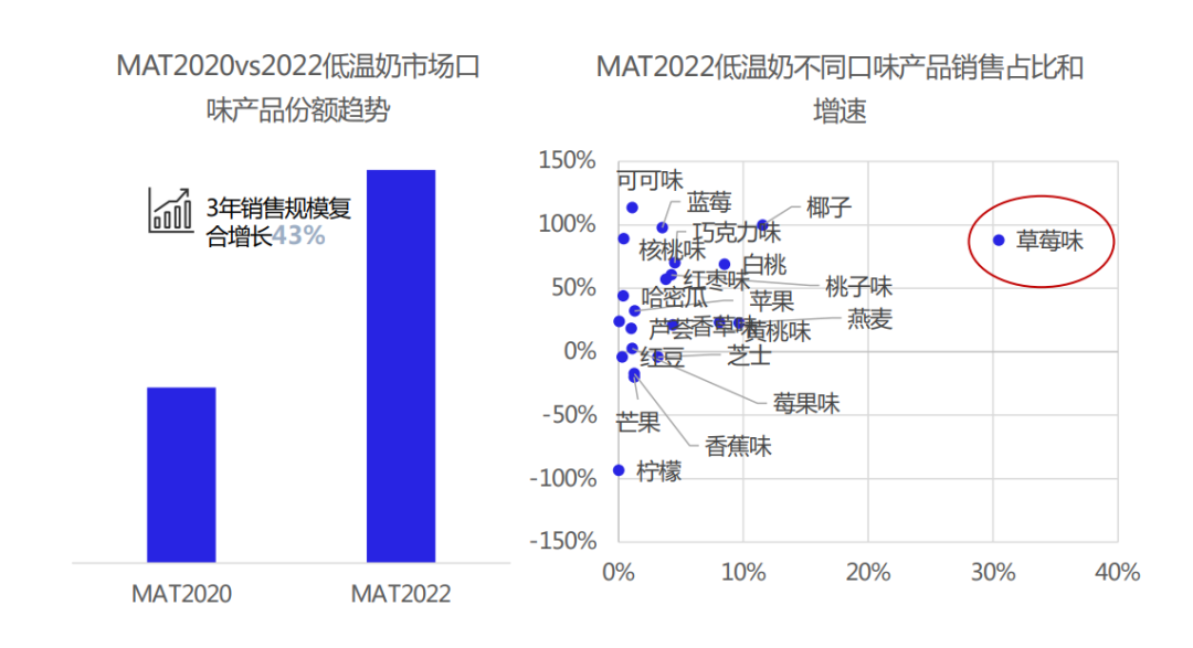 在乳品中,隨著乳制品飲用場景的日?;谖抖嘣蔀橄M者的關(guān)注點。據(jù)天貓發(fā)布2022年的《乳制品趨勢白皮書》數(shù)據(jù)顯示,低溫奶市場的口味產(chǎn)品份額逐年提升,3年復(fù)合增長達43%,草莓味的低溫奶產(chǎn)品更是獨樹一幟,銷售占比超30%。