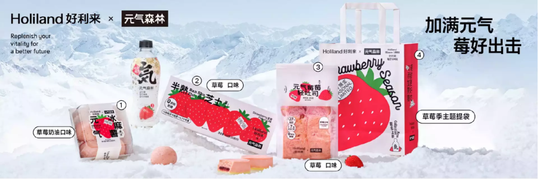 以元氣森林時令限定“流光草莓味氣泡水”為靈感,好利來聯(lián)名元氣森林推出“流光草莓季”系列新品,包括草莓味半熟芝士、元氣莓莓輕吐司、草莓奶油口味元氣冰麻薯。此外,好利來還推出“輕乳雙莓杯”和“輕莓雪山蛋糕”兩款時令西點。這些圍繞草莓元素與健康理念推出的時令產(chǎn)品系列,為消費者帶來沉浸式草莓體驗的同時也為品牌形象注入新意。