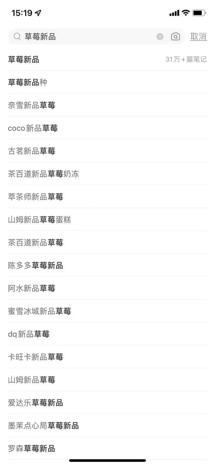 新茶飲品牌們對草莓更是頗有偏愛。口感酸甜,汁水飽滿的草莓與飲品具有天然的“CP”感。在小紅書搜索“草莓新品”,相關(guān)筆記有31萬+,平臺根據(jù)算法推薦的前十個預(yù)選項中,新茶飲相關(guān)的草莓新品占據(jù)8位,奈雪的茶、都可、古茗、茶百道等品牌都推出了相關(guān)的草莓茶飲。