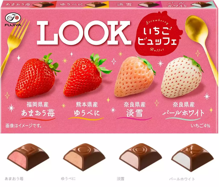 不二家 ルックいちごビュッフェ是不二家在2022年草莓季限時推出的四種草莓夾心巧克力。產(chǎn)品分別采用日本福岡縣“甜王”、熊本縣產(chǎn)“熊紅”、奈良縣產(chǎn)“淡雪”和“珍珠白”四個不同品種的草莓制得。其中,“甜王”外觀為深紅色,風(fēng)味均衡;“熊紅”為鮮紅色,汁液豐富,酸甜適中;“淡雪”為淡粉色,香氣溫和,甜度適中;“珍珠白”為純白色,香氣濃郁,甜味優(yōu)雅,質(zhì)地清新,消費者在一份包裝中可以擁有四種不同的草莓巧克力體驗。