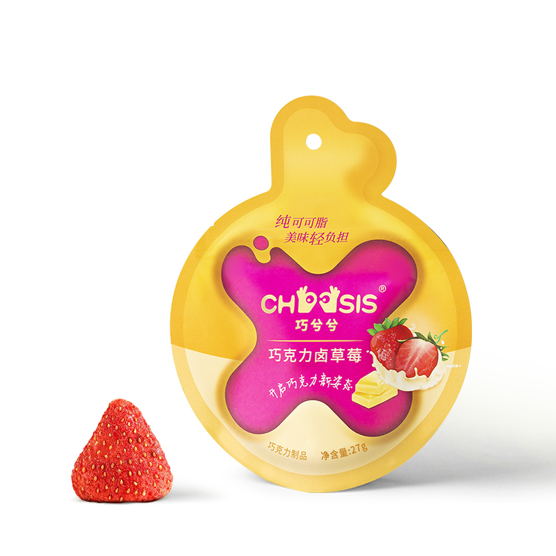 凍干是草莓零食常用的加工方式,添加巧克力涂層的凍干水果也逐漸常見。不過,這兩種形式的水果干都存在口味單一或口味不融合的痛點,同質(zhì)化現(xiàn)象嚴重。