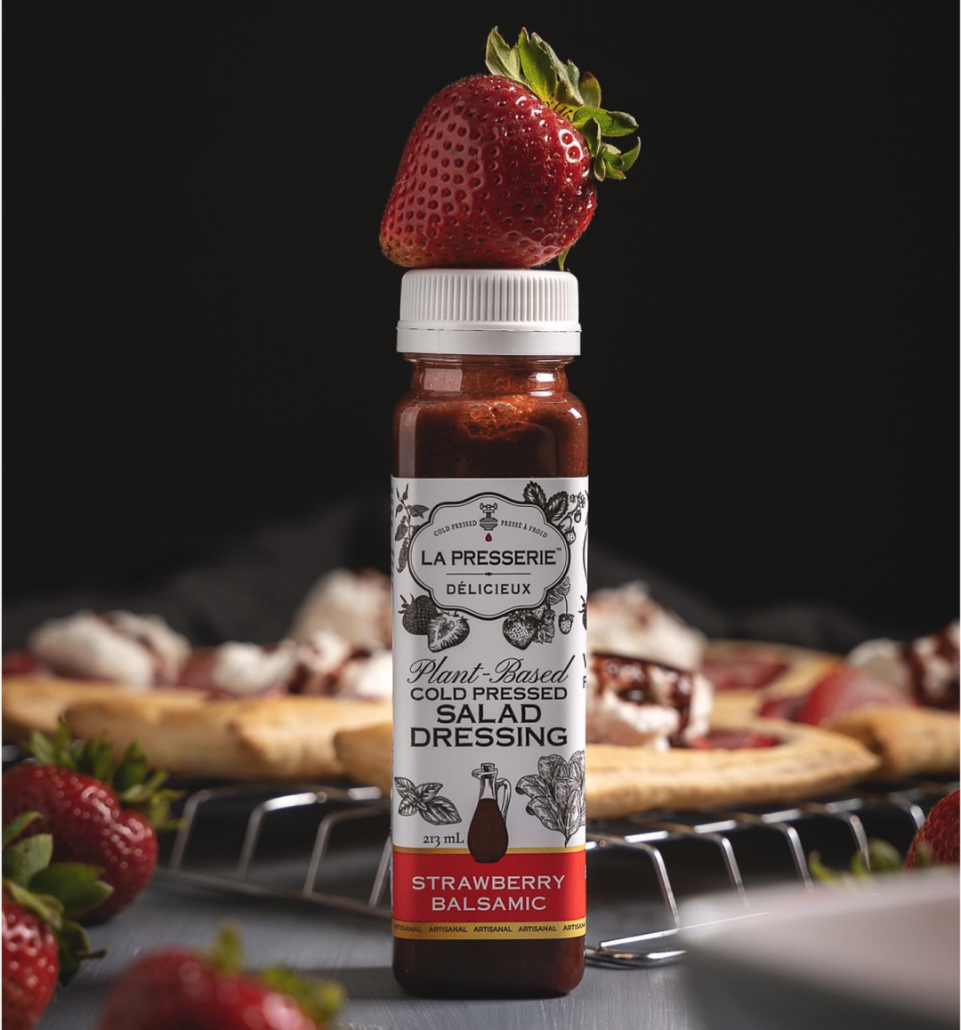 除了零食糖巧,草莓也成功跨界進入調(diào)味品品類。傳統(tǒng)的沙拉醬汁主要使用植物油、蛋黃、醋和多種香辛料調(diào)制而成,口味偏向濃郁厚重。La Presserie推出一款草莓香醋冷榨沙拉汁 Strawberry Balsamic Salad Dressings,成功的讓草莓以調(diào)味品的形式出現(xiàn)在餐桌和灶臺,拓展了草莓應(yīng)用的新領(lǐng)域。