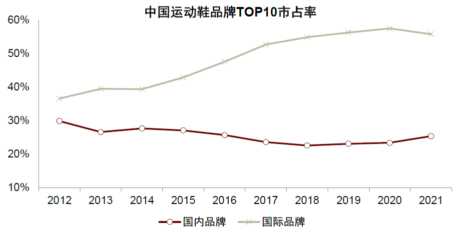在運(yùn)動(dòng)服裝品牌中,2021年還出現(xiàn)了一個(gè)變化。運(yùn)動(dòng)服裝前10名的品牌中,國(guó)內(nèi)品牌市占率合計(jì)達(dá)41%,超過國(guó)際品牌的36%,但在運(yùn)動(dòng)鞋領(lǐng)域,國(guó)外品牌仍舊牢牢占據(jù)主流市場(chǎng),國(guó)內(nèi)品牌市占率合計(jì)僅25%,國(guó)際品牌市占率合計(jì)達(dá)到56%,國(guó)內(nèi)品牌在功能性較強(qiáng)的運(yùn)動(dòng)鞋領(lǐng)域仍有較大的發(fā)展空間。