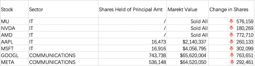但上述機構(gòu)對科技股的態(tài)度在去年第四季度出現(xiàn)分歧:2022年四季度橋水共清倉133只,清倉排在前五的個股中,前三都是芯片股,分別是:72.271萬股AMD(AMD),市值4580萬美元;57.6159萬股美光科技(MU),市值2890萬美元;18.0269萬股英偉達(NVDA),市值2190萬美元,橋水還賣出了94%的微軟(MSFT)、蘋果(AAPL)的持倉,以及砍掉五成谷歌(GOOGL)和35%的META(META)持倉。