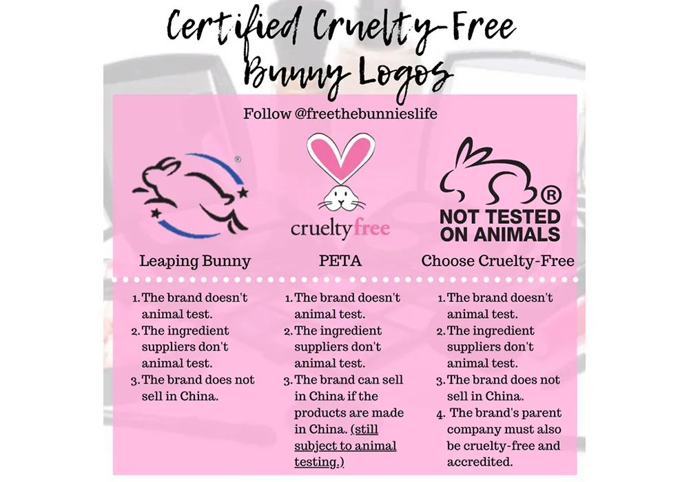 國(guó)際市場(chǎng)上有三個(gè)主要的零殘忍認(rèn)證組織,Leaping Bunny、PETA和Choose Cruelty Free。由于兔子經(jīng)常被當(dāng)做動(dòng)物測(cè)試的對(duì)象,三個(gè)組織都使用了兔子作為零殘忍認(rèn)證標(biāo)志。