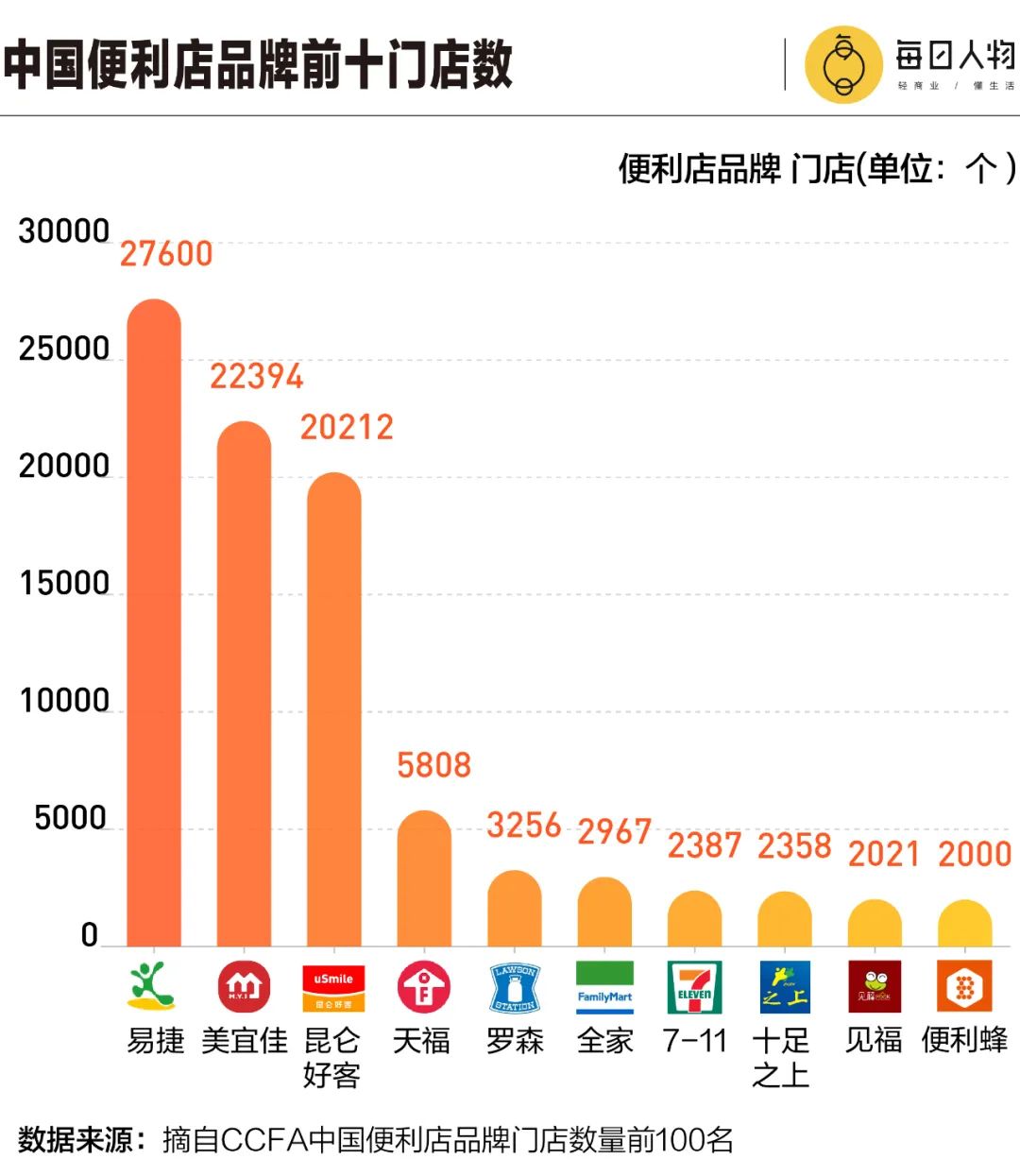 全國便利店品牌門店的數(shù)量,排名第一的是中石化旗下的易捷便利店,一共27600家門店。緊隨其后的就是美宜佳,門店總量達到了22394家。