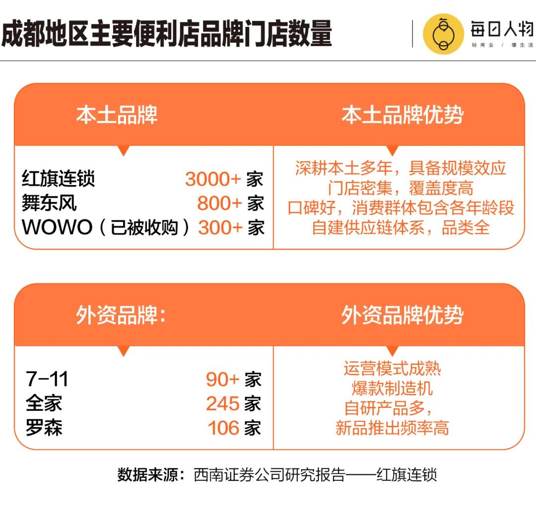 面對口碑、服務和創(chuàng)新能力都夠強的紅旗連鎖,羅森選擇了更迂回的路線,在成都首店開幕前收購了一家發(fā)展迅速的本土品牌WOWO。在被收購前,WOWO在成都的門店數(shù)已有上千家,是紅旗連鎖、芙蓉興盛的有力競爭對手。
