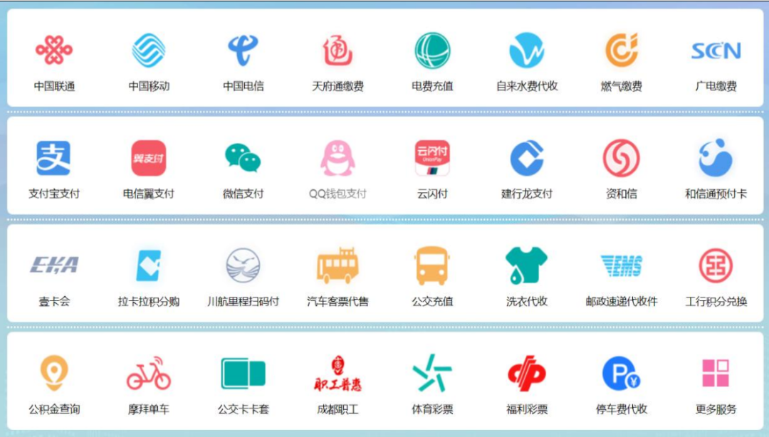 和不斷在省外擴張的美宜佳不同,紅旗連鎖牢牢扎根于四川省內,一步一個腳印。從剛開始的社區(qū)便利型超市開始,“打通社區(qū)100米”。常規(guī)的燃氣繳費、自來水費代收,在紅旗連鎖,你甚至可以為家里打游戲的小孩支付QQ錢包,平時外出可以在紅旗連鎖充公交卡、掃碼付川航里程、買汽車票,有的紅旗連鎖甚至提供洗衣代收、郵政代收件,還可以充當彩票站。
