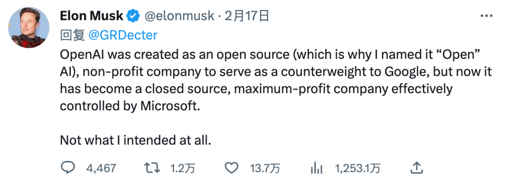 作為聯(lián)合創(chuàng)始人之一,馬斯克對OpenAI的現(xiàn)狀非常不滿,公開發(fā)聲:“OpenAI最初是作為一家開源(這就是為什么我把它命名為「Open」AI)的非營利性公司而創(chuàng)建的,為了抗衡谷歌,但現(xiàn)在它已經(jīng)成一家閉源的營利性公司,由微軟有效控制……這完全不是我的本意。”