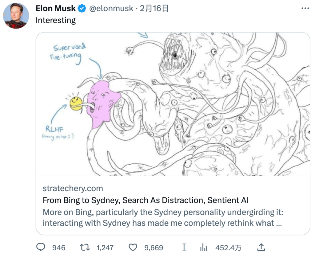 隨后他又轉(zhuǎn)發(fā)關(guān)于Bing聊天機器人荒謬聊天體驗的報道,評論稱:“有意思”。