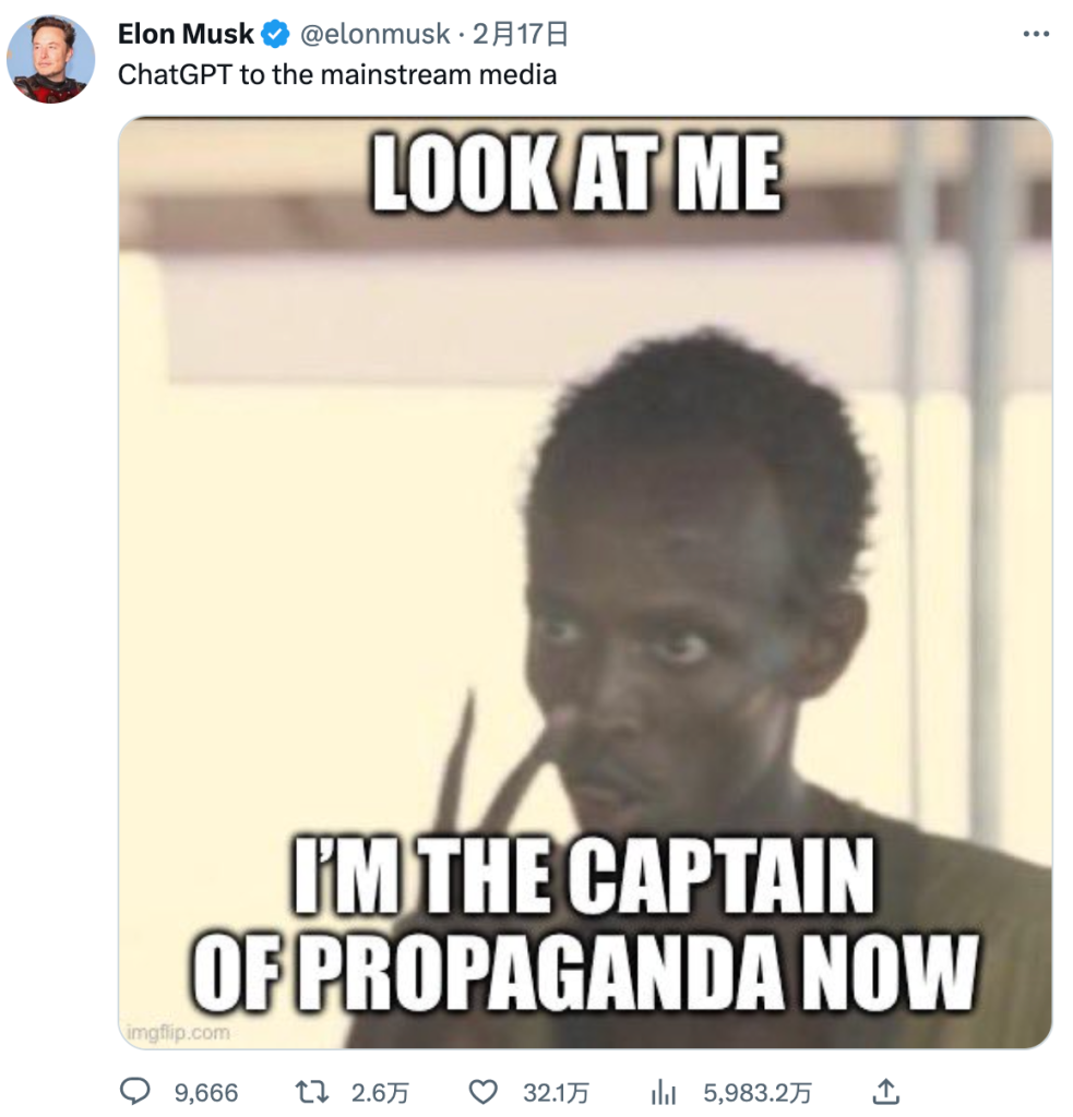 隔天又發(fā)表情包嘲諷ChatGPT對于主流媒體來說現(xiàn)在是“宣傳隊長”,推文點贊數(shù)已超32萬。