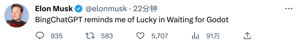 智東西2月19日報道,最近幾天,“AI安全宣傳大使”馬斯克在社交平臺相當(dāng)活躍,對AI聊天機器人ChatGPT帶來的混亂現(xiàn)狀和ChatGPT背后AI公司OpenAI的背離初心冷嘲熱諷,比如今晚最新發(fā)布推文,稱Bing聊天機器人讓他想起荒誕戲劇代表作《等待戈多》中的幸運。