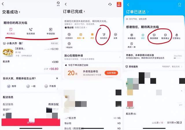 圖/訂單結(jié)束后的外賣頁(yè)面(從左至右分別為抖音外賣、美團(tuán)外賣、餓了么)