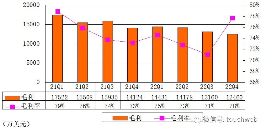搜狐2022年第四季度毛利為1.25億美元,毛利率為78%,上年同期的毛利率為73%。