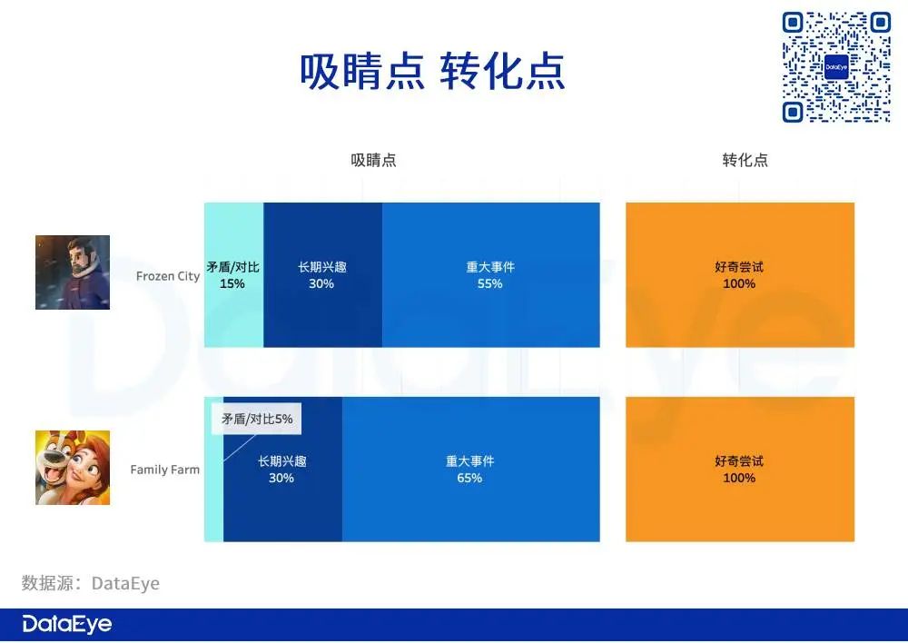 吸睛點:兩款游戲的吸睛點一致,占比稍有不同?!局卮笫录课c占比過半。開頭三秒往往是一個“緊張、危急”的畫面/場景【重大事件】,引發(fā)共情。