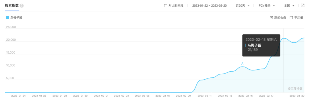 據(jù)百度指數(shù)顯示,烏梅子醬的搜索指數(shù)在2月10日開(kāi)始上升,2月14日情人節(jié)出現(xiàn)一個(gè)小高峰,之后在2月18日再一步攀升。抖音上用來(lái)制作翻唱視頻的合拍伴奏內(nèi)容,基本都在2月8、9日發(fā)布,給用戶(hù)拍翻唱視頻提供了便利,從而帶來(lái)2月10日搜索指數(shù)上升的結(jié)果,這也進(jìn)一步佐證了《烏梅子醬》的熱度很可能來(lái)自于翻唱。