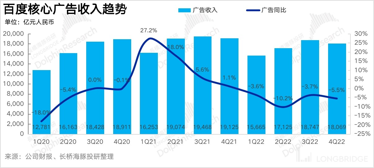 但也因?yàn)槭袌?chǎng)預(yù)期足夠低、去年基數(shù)也比較友好,實(shí)際百度核心的廣告收入并沒(méi)有那么差,海豚君基于百度財(cái)報(bào)核算出來(lái)的百度核心廣告收入是181億,同比下跌-5.5%,稍優(yōu)于市場(chǎng)預(yù)期的-7%下滑。
