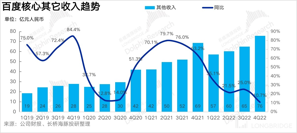 四季度的疫情不僅影響了廣告,也影響了智慧云等創(chuàng)新業(yè)務(wù)的客戶交付進(jìn)度。百度核心其他收入約在76 億,同比增長(zhǎng)接近 11%,顯著弱于2022年前三個(gè)季度,不過(guò)市場(chǎng)預(yù)期的調(diào)整比較及時(shí),也更保守,僅對(duì)創(chuàng)新業(yè)務(wù)維持7%的增長(zhǎng)預(yù)期。