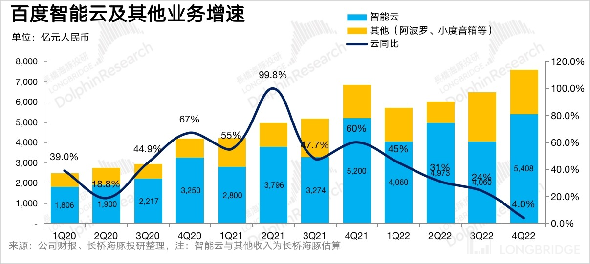 作為創(chuàng)新業(yè)務(wù)的主要支撐,智能云四季度收入大約54億,同比增長(zhǎng)只有4%,相比上季度增速顯著下滑。首先是有全國(guó)大面積疫情對(duì)商務(wù)出行和合同交付的影響,此外,由于與上季度相比放緩明顯較大,因此海豚君認(rèn)為百度對(duì)低效益的項(xiàng)目剝離應(yīng)該還在持續(xù)。