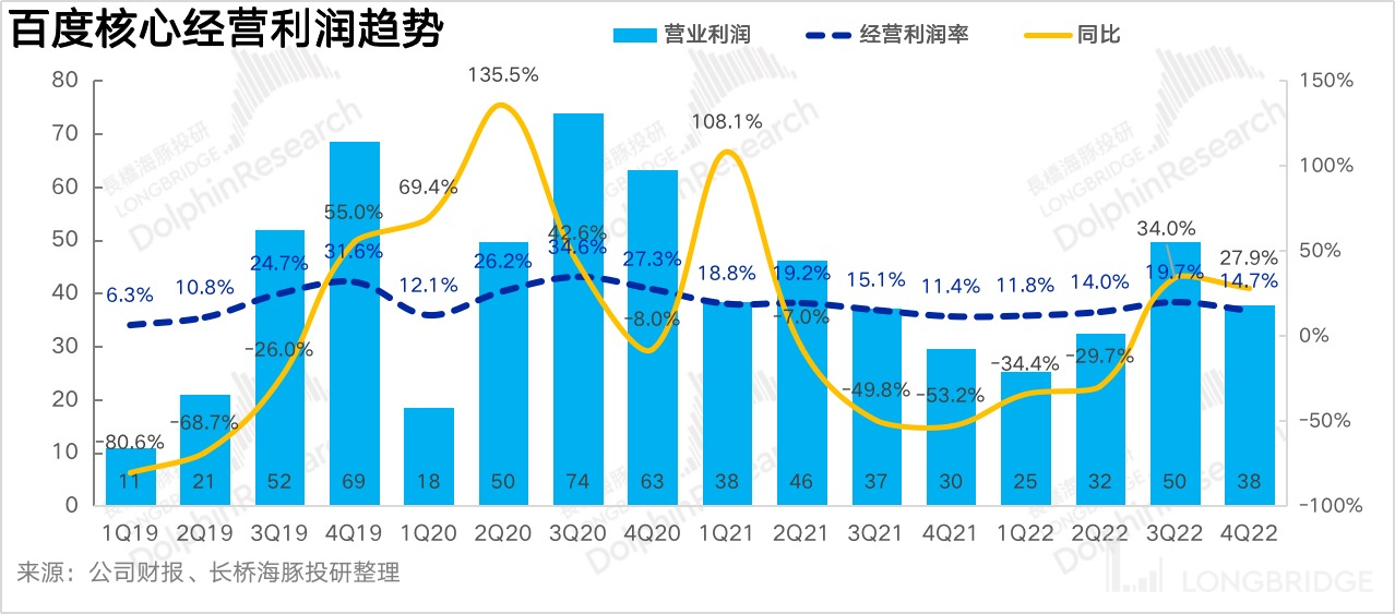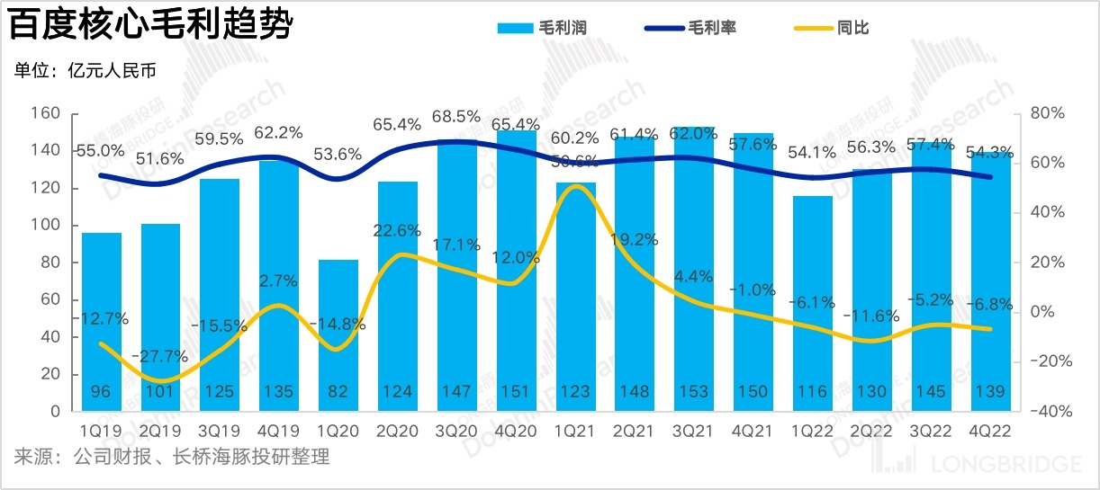 但單看百度核心,四季度毛利下滑近7%,核心毛利率走低了3個(gè)點(diǎn)至54.3%,比市場(chǎng)預(yù)期的要差一些。通過(guò)與往年相比,在疫情相對(duì)嚴(yán)重的時(shí)期,百度的毛利率都會(huì)走低至53%-54%,雖然低毛利率的智能云等其他業(yè)務(wù)在整體收入中的占比在走高,但在關(guān)閉盈利低質(zhì)的項(xiàng)目后,本身也在走改善趨勢(shì)。