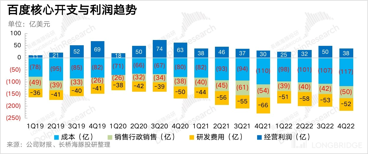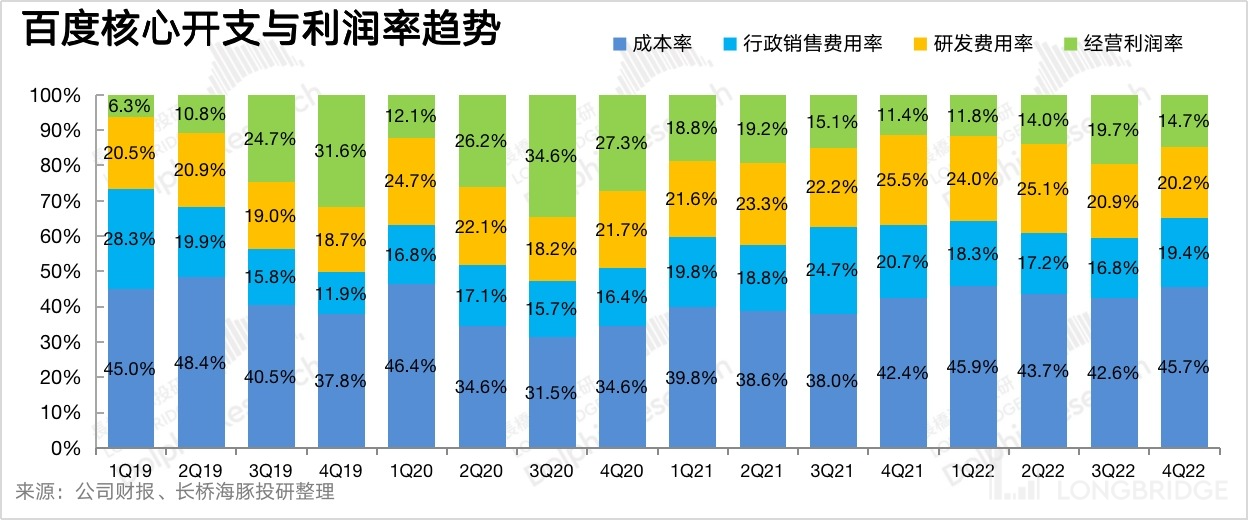經(jīng)營(yíng)費(fèi)用上,百度進(jìn)入2022年已經(jīng)進(jìn)入明顯的降本增效周期,銷售費(fèi)用率一直在持續(xù)收縮當(dāng)中。四季度除了銷售費(fèi)用繼續(xù)同比下滑但幅度放緩?fù)?,這次超預(yù)期的是在研發(fā)上的費(fèi)用開(kāi)支顯著加速收縮,在繼三季度個(gè)位數(shù)下滑后,這個(gè)季度下滑幅度進(jìn)一步擴(kuò)大到-21.7%。