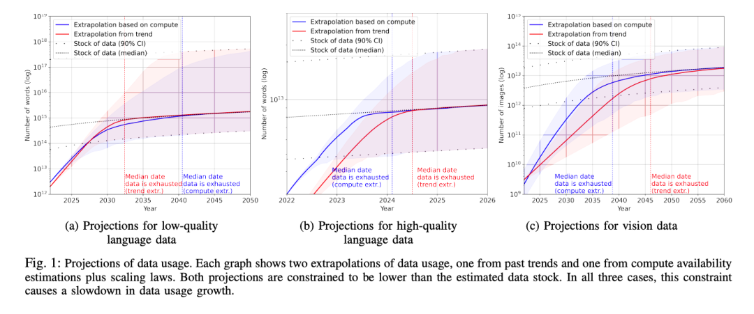 從數(shù)據(jù)供給的角度看,《Will we run out of data? An analysis of the limits of scaling datasets in Machine Learning》(P Villalobos, J Sevilla, L Heim, T Besiroglu, M Hobbhahn, A Ho [University of Aberdeen &MIT &Centre for the Governance of AI &University of Tübingen] (2022) )的估算結論是到2026年左右,高質量的NLP數(shù)據(jù)將會用光,低質量NLP數(shù)據(jù)會在2030到2050年用光,而低質量圖像數(shù)據(jù)會在2030到2060年用光。