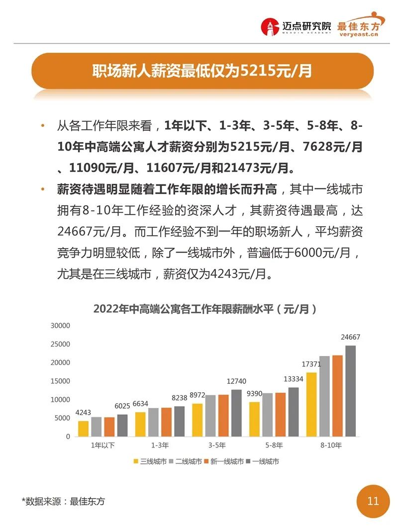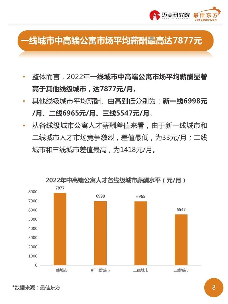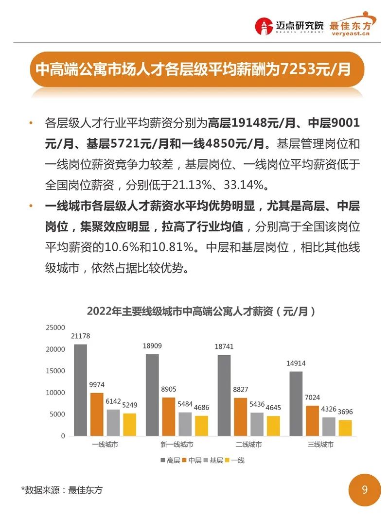 2022年中高端公寓市場人才平均薪酬為7253元/月。
