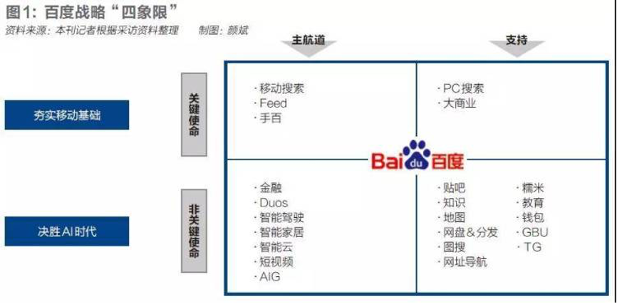 陸奇在百度任職的一年多時(shí)間里,留下最寶貴的是戰(zhàn)略的梳理,在陸奇的梳理中,定下來(lái)以手百、移動(dòng)搜索、feed為關(guān)鍵使命的主航道,同時(shí)主航道上還有智能云、智能駕駛等業(yè)務(wù)為非關(guān)鍵使命。