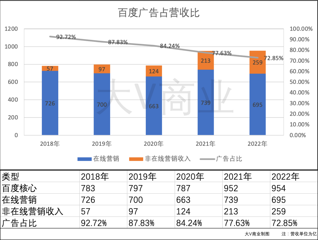 百度廣告占營(yíng)收的比例也在逐年下降,從2018年的92.7%降低到2022年的72.8%。