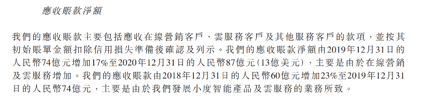 百度回港上市的招股書(shū)中提到,應(yīng)收賬款的增加主要是由于發(fā)展小度智能產(chǎn)品及云服務(wù)所致,鑒于小度智能在百度非在線營(yíng)銷(xiāo)營(yíng)收中占比不高,那么可能更多來(lái)自于智能云服務(wù)。