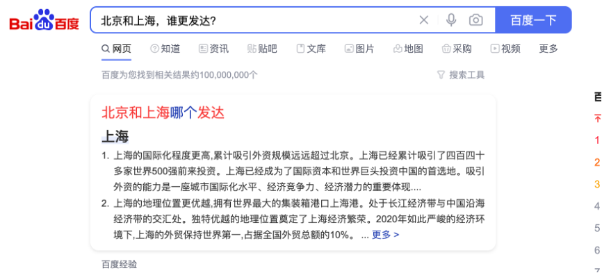 其實(shí)現(xiàn)在的百度搜索也在漸進(jìn)地進(jìn)化,生成式搜索早已初階實(shí)現(xiàn)并應(yīng)用。百度的搜索結(jié)果頁(yè)很早之前就已經(jīng)實(shí)現(xiàn)了簡(jiǎn)單的搜索信息整合,比如在經(jīng)典的“北京和上海,誰(shuí)更發(fā)達(dá)?”的這類經(jīng)典問(wèn)題下,搜索引擎會(huì)根據(jù)搜索結(jié)果進(jìn)行直接的數(shù)據(jù)對(duì)比,甚至是計(jì)算,給出直接的答案。