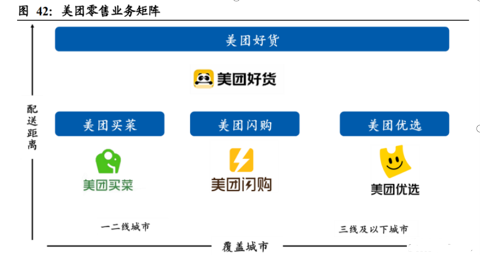 在零售板塊的業(yè)務(wù)矩陣上,美團(tuán)已經(jīng)形成買菜、閃購(gòu)、優(yōu)選三大業(yè)務(wù)。前置倉(cāng)模式的美團(tuán)買菜與平臺(tái)模式的美團(tuán)閃購(gòu)主要聚焦一二線城市,社區(qū)團(tuán)購(gòu)模式的美團(tuán)優(yōu)選則主要聚焦三線及以下城市,盡可能覆蓋更多用戶。