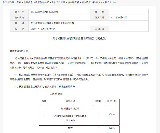 3月3日,證監(jiān)會(huì)官網(wǎng)信息顯示,證監(jiān)會(huì)核準(zhǔn)設(shè)立聯(lián)博基金管理有限公司。該公司由美國資管巨頭聯(lián)博集團(tuán)旗下聯(lián)博香港有限公司100%控股,注冊資本為1億元人民幣,公司注冊地為上海市,經(jīng)營范圍為公開募集證券投資基金管理、基金銷售、私募資產(chǎn)管理和中國證監(jiān)會(huì)許可的其他業(yè)務(wù)。