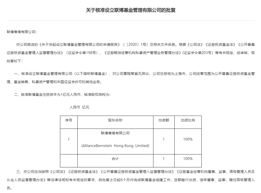 證監(jiān)會要求,自批復(fù)之日起6個月內(nèi),聯(lián)博基金需完成組建工作,足額繳付出資,選舉董事、監(jiān)事,聘任高級管理人員;自取得經(jīng)營證券期貨業(yè)務(wù)許可證之日起6個月內(nèi),聯(lián)博基金應(yīng)當(dāng)發(fā)行公募基金產(chǎn)品。