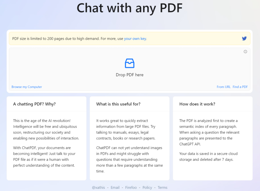 目前的免費版最大可傳200頁的PDF,超過了就要用自己在OpenAI申請的API賬戶了。
