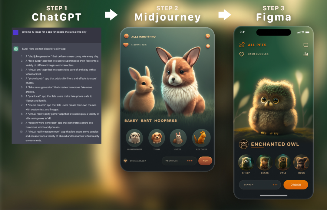 最受歡迎的市場在企業(yè)端,因為付費意愿最高,所以大量的產(chǎn)品都是文案生成、話術(shù)優(yōu)化、客服對接這些,也有游戲開發(fā)者分享了一套完整流程,從用ChatGPT提出要求,到Midjourney繪制素材,最后存入Figma,絲滑得不可思議。