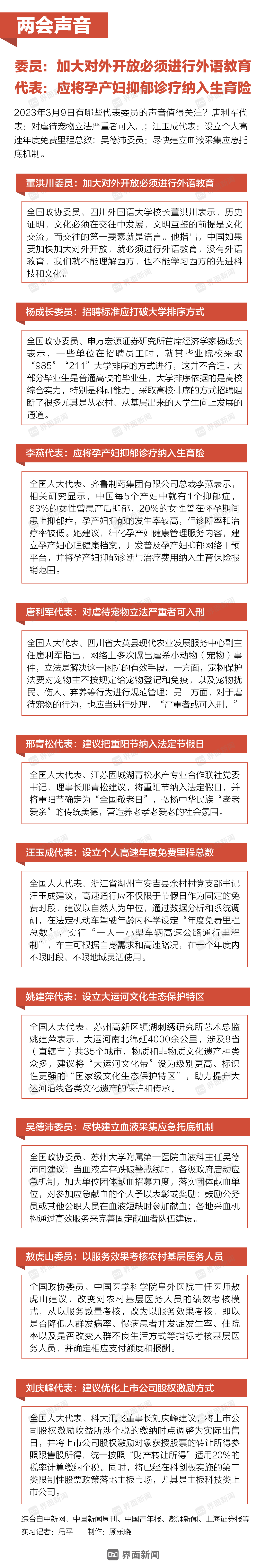 2023年3月9日有哪些代表委員的聲音值得關(guān)注?唐利軍代表:對虐待寵物立法嚴(yán)重者可入刑;汪玉成代表:設(shè)立個人高速年度免費(fèi)里程總數(shù);吳德沛委員:盡快建立血液采集應(yīng)急托底機(jī)制。