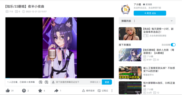 與之相對比,アホ鶴B站粉絲數(shù)只有600出頭,但珈樂AI翻唱的《錯位時空》獲得了2.5萬的播放量,更不用說存夢P高達(dá)8.5萬播放量的《反方向的鐘》,他的粉絲數(shù)只有927。