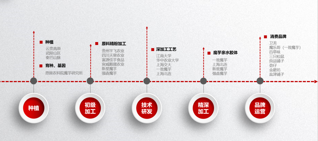 在產(chǎn)業(yè)上游,從事魔芋產(chǎn)品研究的企業(yè)也屈指可數(shù)。相關(guān)行業(yè)資料顯示,育種、基因方面有恩施農(nóng)科院魔芋研究所;原料精粉加工方面有強(qiáng)森魔芋、新星魔芋等;深加工工藝則有江南大學(xué)、華中農(nóng)業(yè)大學(xué)、上海交大、一致魔芋、上海北連五家;消費(fèi)端有衛(wèi)龍、魔樂(lè)哥(一致魔芋)、百草味、三只松鼠等常見(jiàn)品牌。