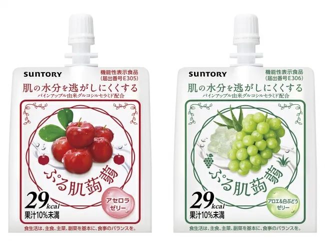 在魔芋果凍方面,伴隨著零食的健康化趨勢(shì),功能性魔芋果凍開(kāi)始走向市場(chǎng)。2020年,三得利推出了“Puruhada Konnyaku Acerola Jelly”和“Same Aloe &White Grape Jelly”兩款產(chǎn)品,以富含葡萄糖神經(jīng)酰胺為特點(diǎn),稱其具有“鎖住皮膚水分”的能力。