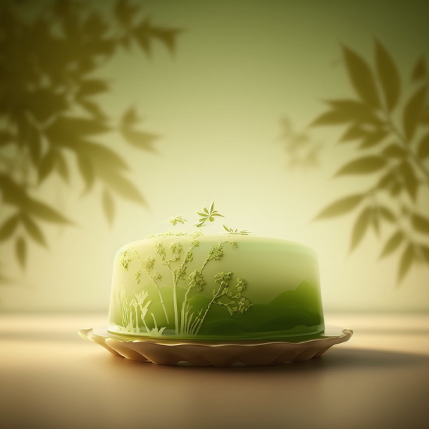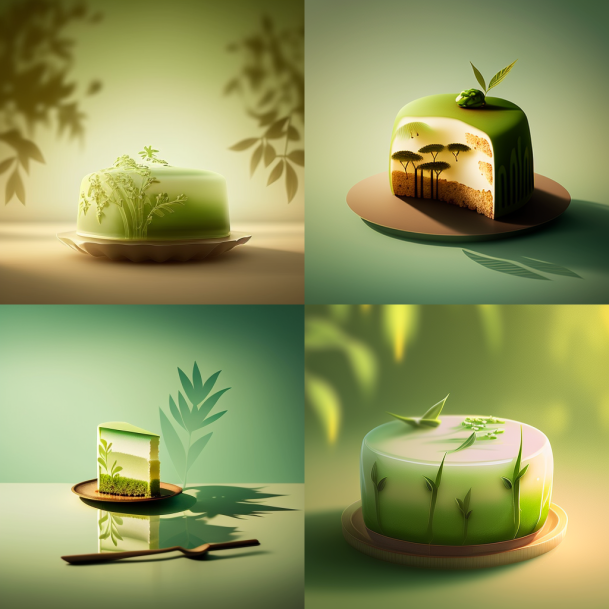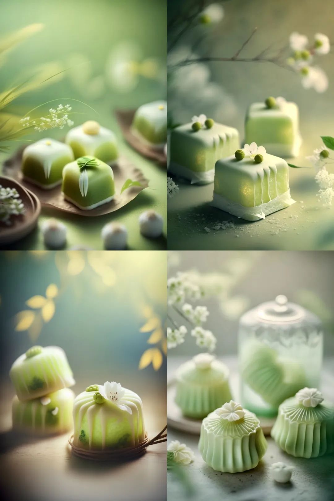 Midjourney完美地融合食物和光影,晨光落在青綠色的蛋糕上,給人以清新靜謐之感。
