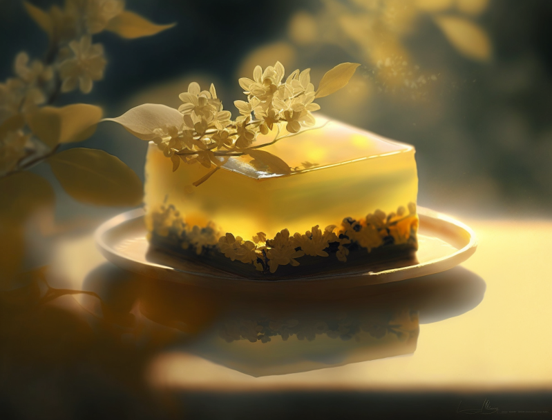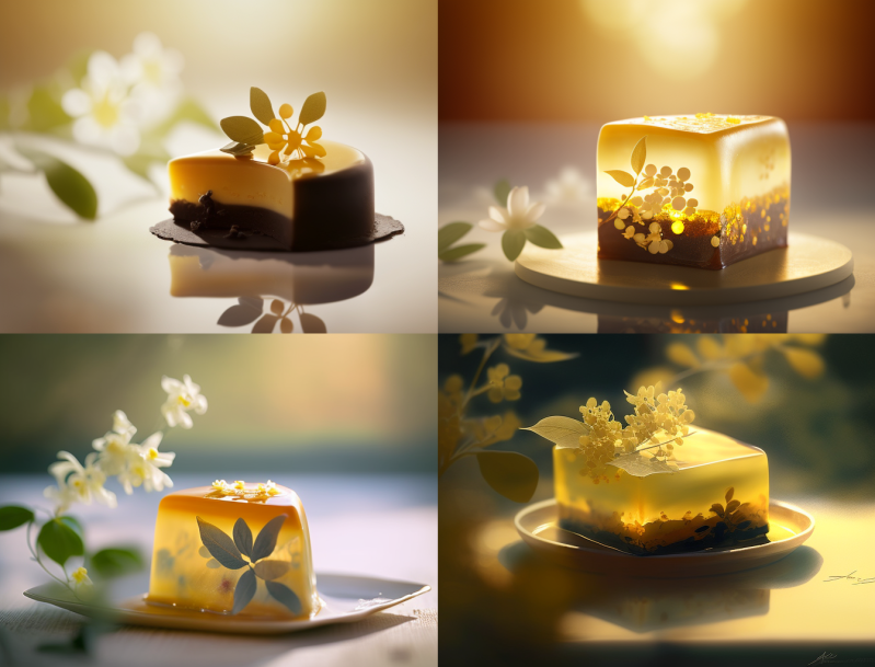 Midjourney果然不負眾望,溫暖的畫面帶著馥郁的桂花香氣,這塊小小糕點的配方中似乎也被悄悄地加入了一勺秋日陽光。