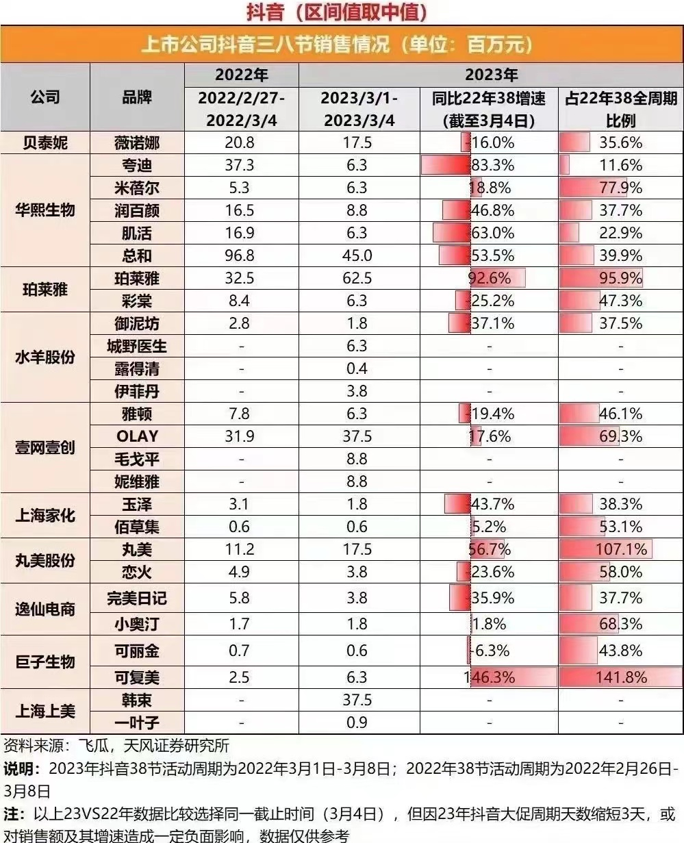 據(jù)天風(fēng)證券研究所數(shù)據(jù)顯示,在抖音平臺(tái),38大促(2023.3.1-2023.3.4)國(guó)內(nèi)上市公司中,僅珀萊雅、丸美、米蓓爾、可復(fù)美呈增長(zhǎng)趨勢(shì)。其中,巨子生物旗下的可復(fù)美同比增長(zhǎng)146.3%,增速迅猛。