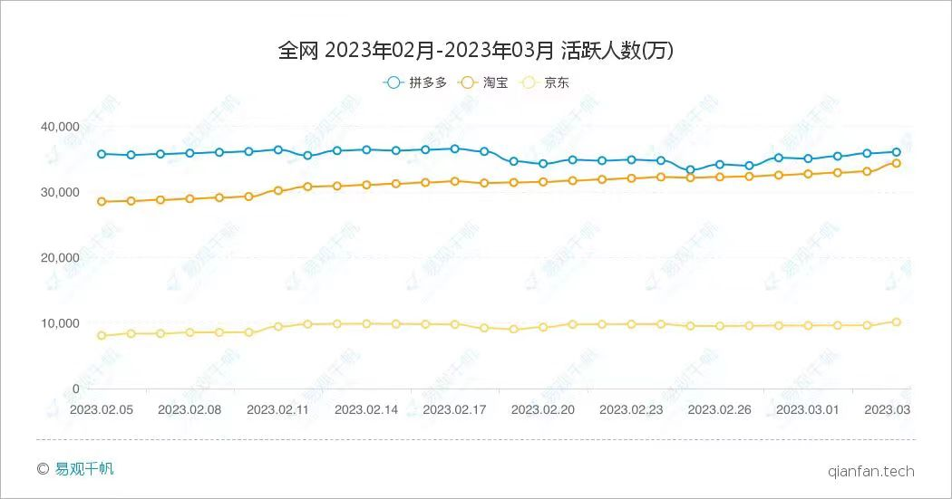 在易觀千帆公布的數(shù)據(jù)中,拼多多、淘寶和京東這三家電商平臺(tái)近30日全網(wǎng)日活數(shù)據(jù)如下圖所示:
