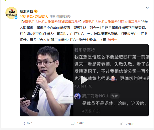 3月13日,“騰訊T13技術(shù)大佬黃希彤被曝遭裁員”的詞條登上熱搜,引起網(wǎng)友熱議。