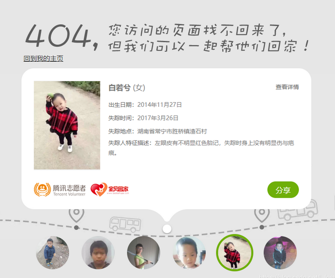 第一次是騰訊404尋親頁面。這是黃希彤通過自己影響力打造的公益項(xiàng)目,被網(wǎng)友稱贊“有大情懷”。第一期404失蹤兒童信息曝光不久,便成功幫助4個(gè)孩子回家團(tuán)聚。