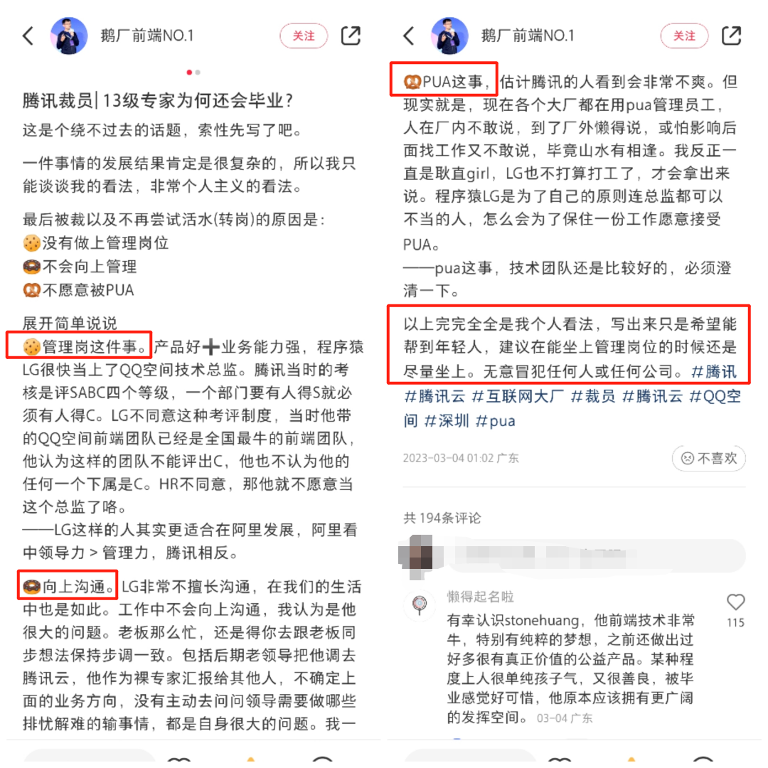 其夫人還透露了其被裁員的原因:“沒有坐上管理崗位,不會(huì)向上管理,不愿意被PUA?!?/p>