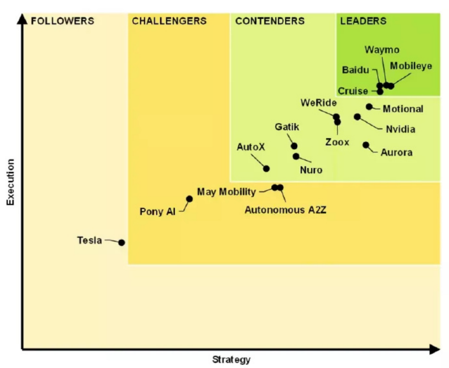 作為佐證,近日調研公司Guidehose Insights發(fā)布了一份報告,對16家從事自動駕駛技術研發(fā)的知名企業(yè)進行排名。并根據(jù)執(zhí)行能力(Execution)和策略能力(Strategy)將其分為四類:“領導者(Leaders)”、“競爭者(Contenders)”、“挑戰(zhàn)者(Challengers)”、“跟隨者(Followers)”。