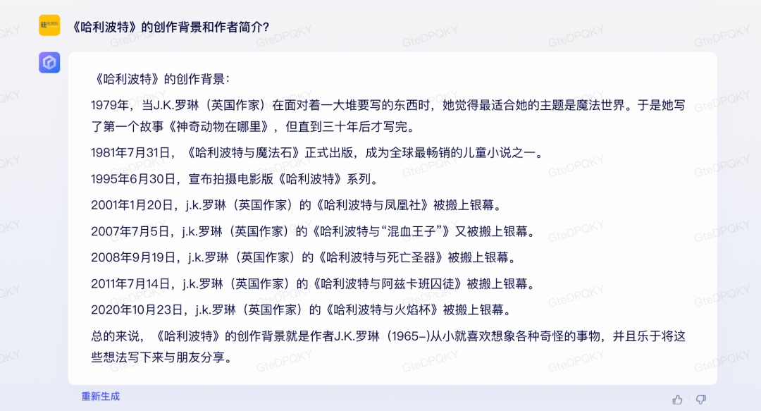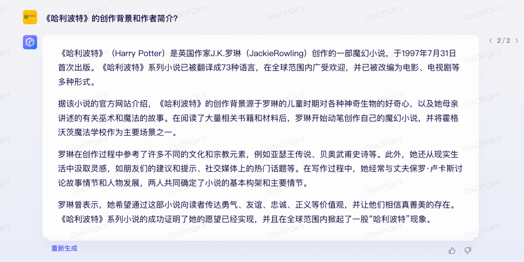 對(duì)于《哈利波特》的創(chuàng)作背景和作者簡(jiǎn)介,文心一言剛開(kāi)始給了一個(gè)“省事”的答案。